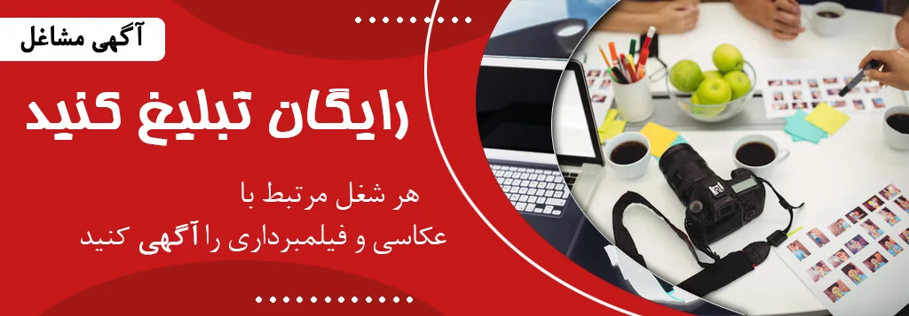 شما می توانید تبلیغ شغل خود را در هر آگهی درج نمایید تا همکاران و خدمات گیران با شما ارتباط برقرار کنند. توجه کنید فقط مشاغل مرتبط با عکاسی و فیلمبرداری که در دسته بندی ها ذکر می شوند قابل نمایش هستند.