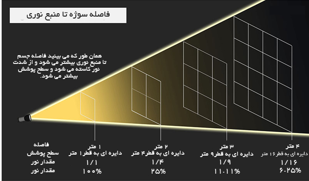 • با دور شدن از منبع نوری فضای تحت پوشش بیشتر می‌شود ولی از شدت نور کاسته می‌شود.