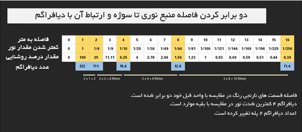 • اگر فاصله بین سوژه و منبع نور را دو برابر کنیم، نور می‌تواند سطحی 4 برابر بزرگ‌تر از حالت قبلی خود را روشن کند.