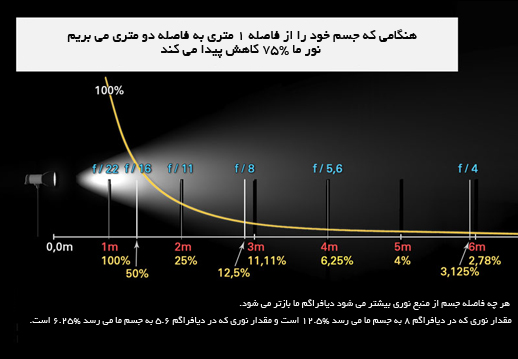 • دقت کنید زمانی که فاصله میان منبع نوری و سوژه اول یک متر است نور بسیار کمتری به سوژه چهارم می‌رسد.