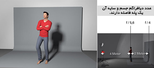 • در بخش بالا گفتیم که فاصله گرفتن سوژه از منبع نوری از شدت نور می‌کاهد.