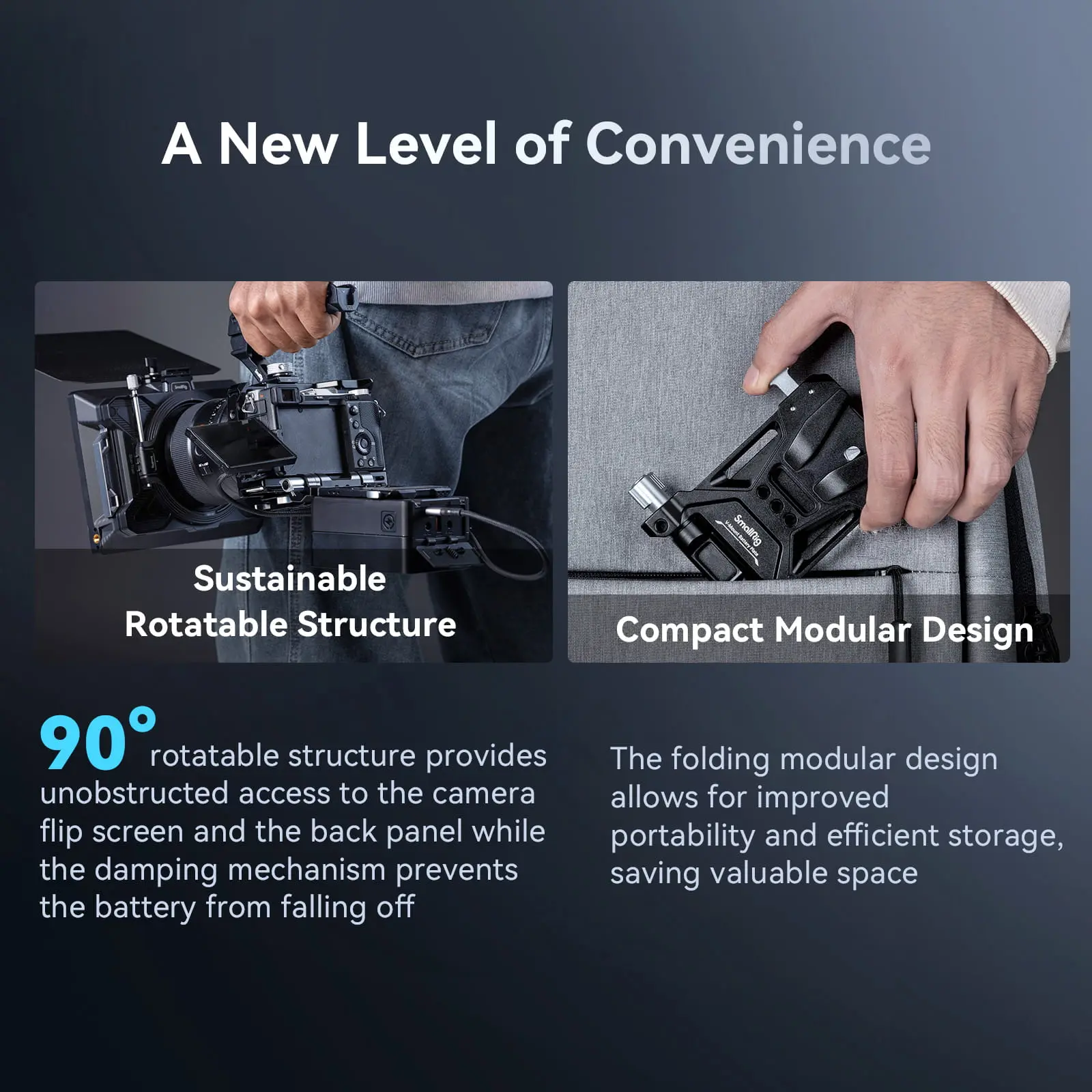 طراحی چرخشی 180 درجهای پلیت نصب باتری یکی دیگر از نقاط قوت آن است. شما میتوانید پلیت را به سمت جلو بچرخانید تا در هنگام فیلمبرداری به راحتی به نمایشگر دوربین دسترسی داشته باشید یا به عقب ببرید تا فضای بیشتری روی ریک خود داشته باشید. همچنین میرایی محوری تعبیهشده در طراحی، از افتادن یا حرکت ناگهانی تجهیزات جلوگیری میکند.